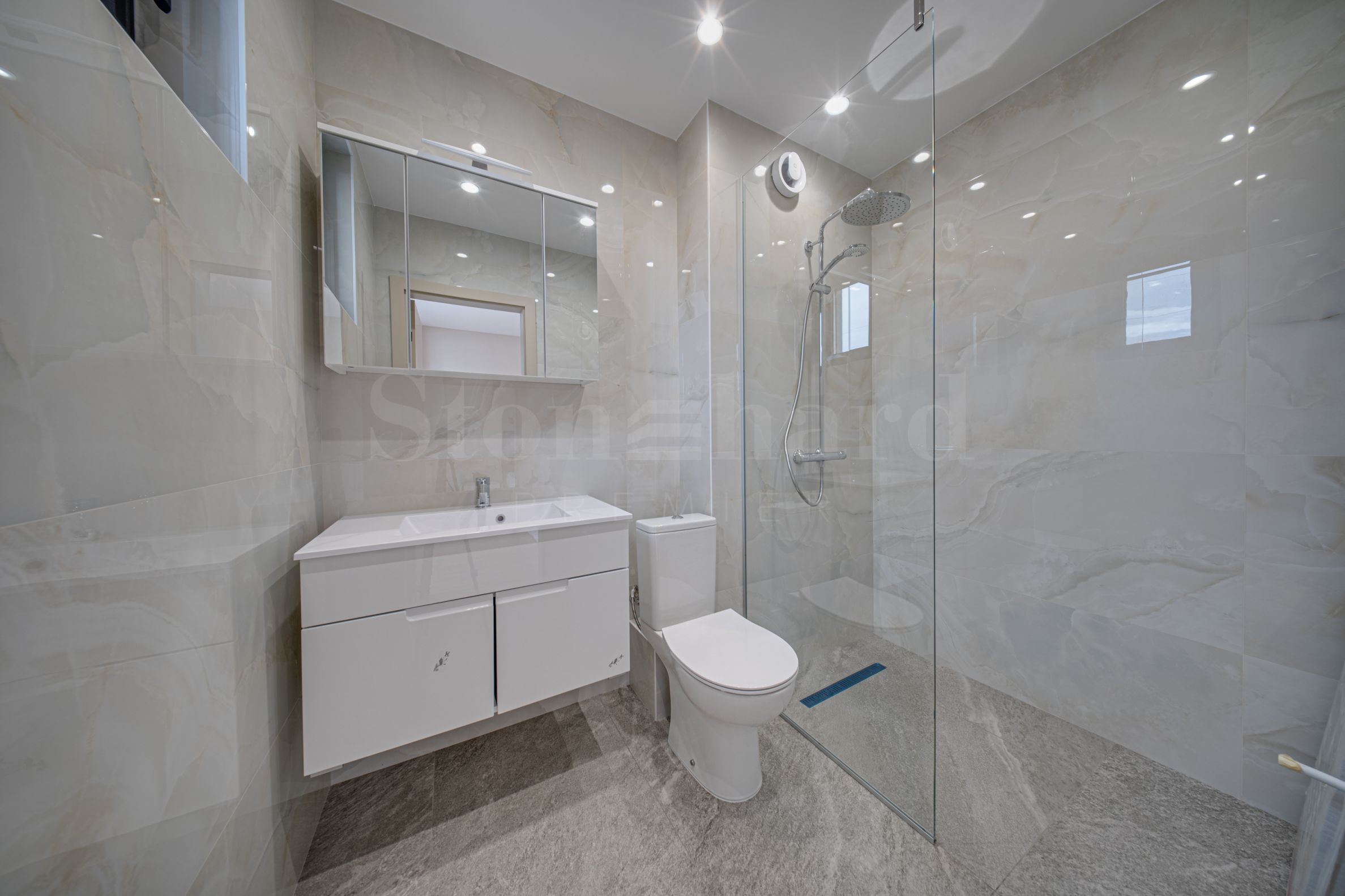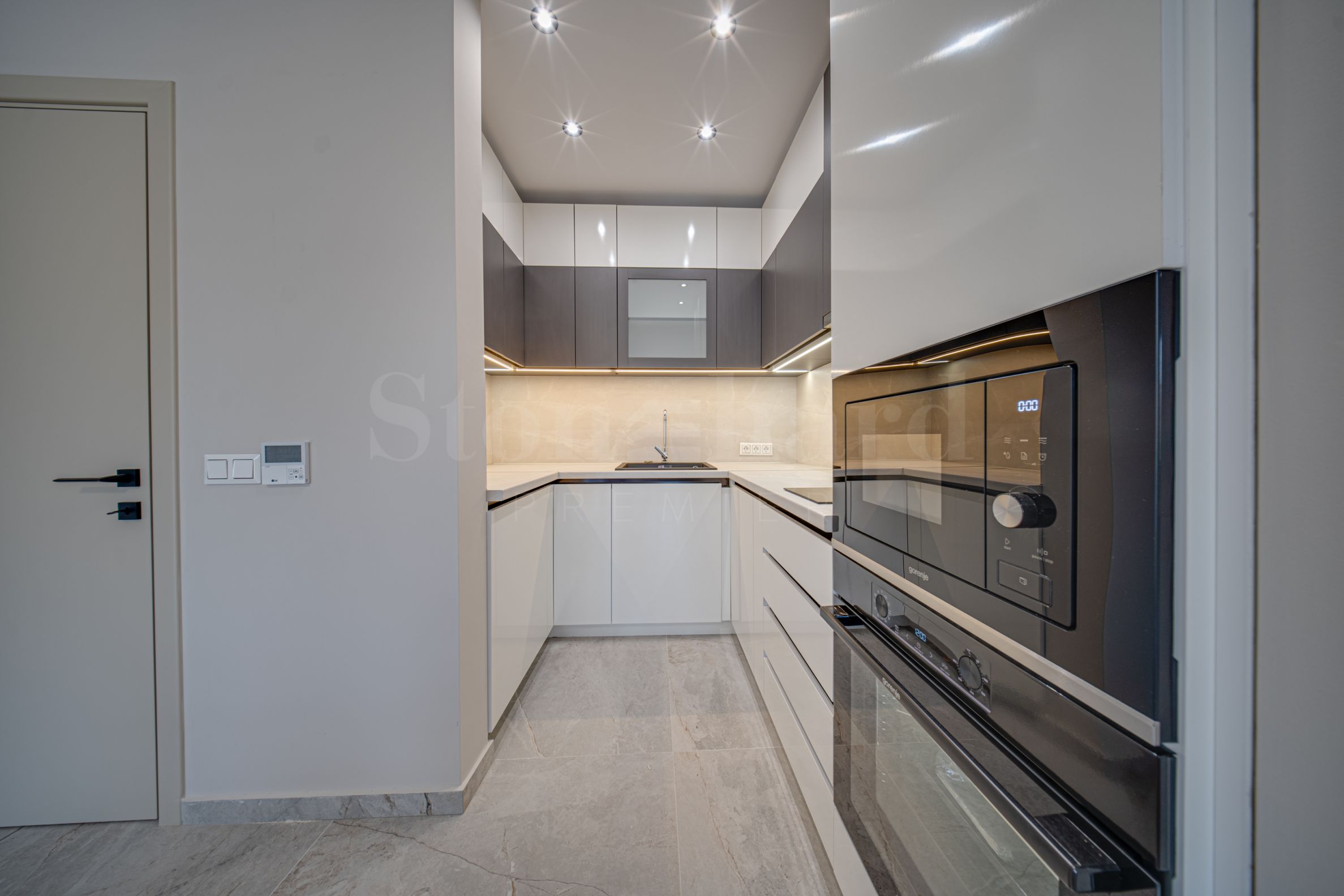 Подови су направљени од висококвалитетних гранитних плочица и природног паркета, зидови су обојени латексом у неутралним бојама, а намештај и опрема високе класе су индивидуално дизајнирани.