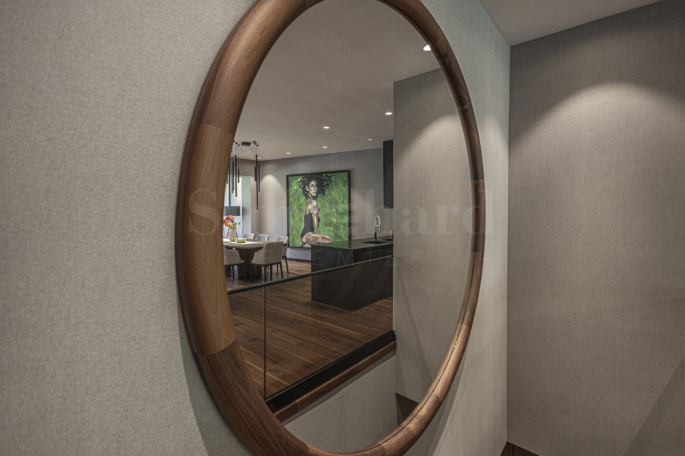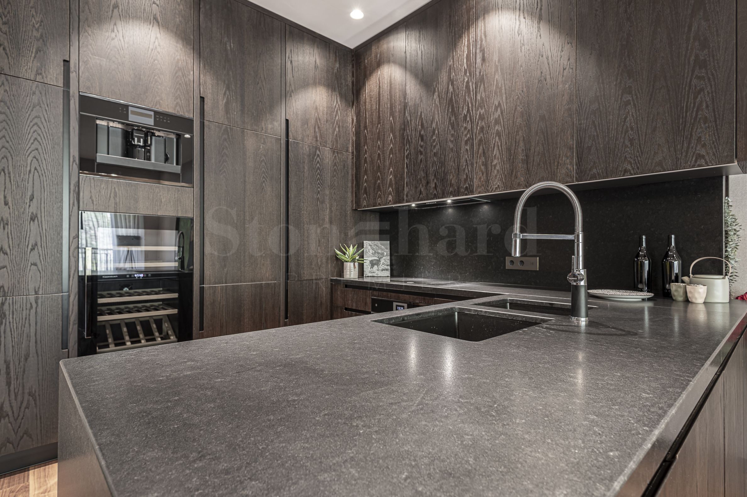 Apartman je završen i namešten sa najkvalitetnijim materijalima, nameštajem i uređajima. U dnevnoj sobi je ugrađena moderna i funkcionalna kuhinja sa ugrađenim uređajima Miele. Svi prostori osim kupatila su završeni podnim oblogama od prirodnog parketa.