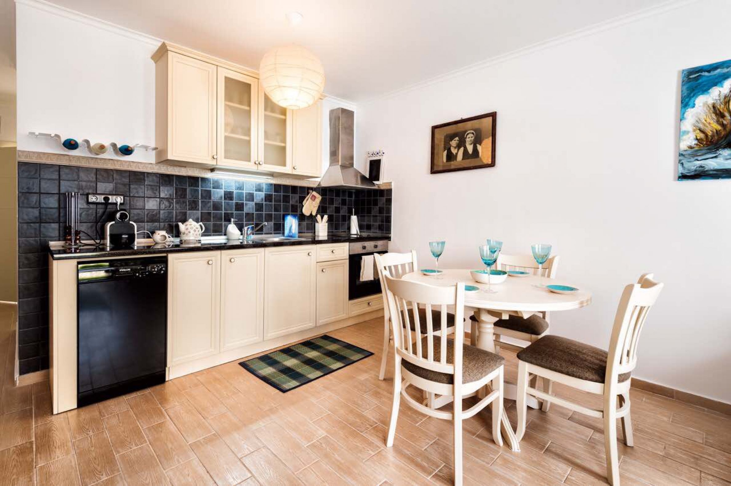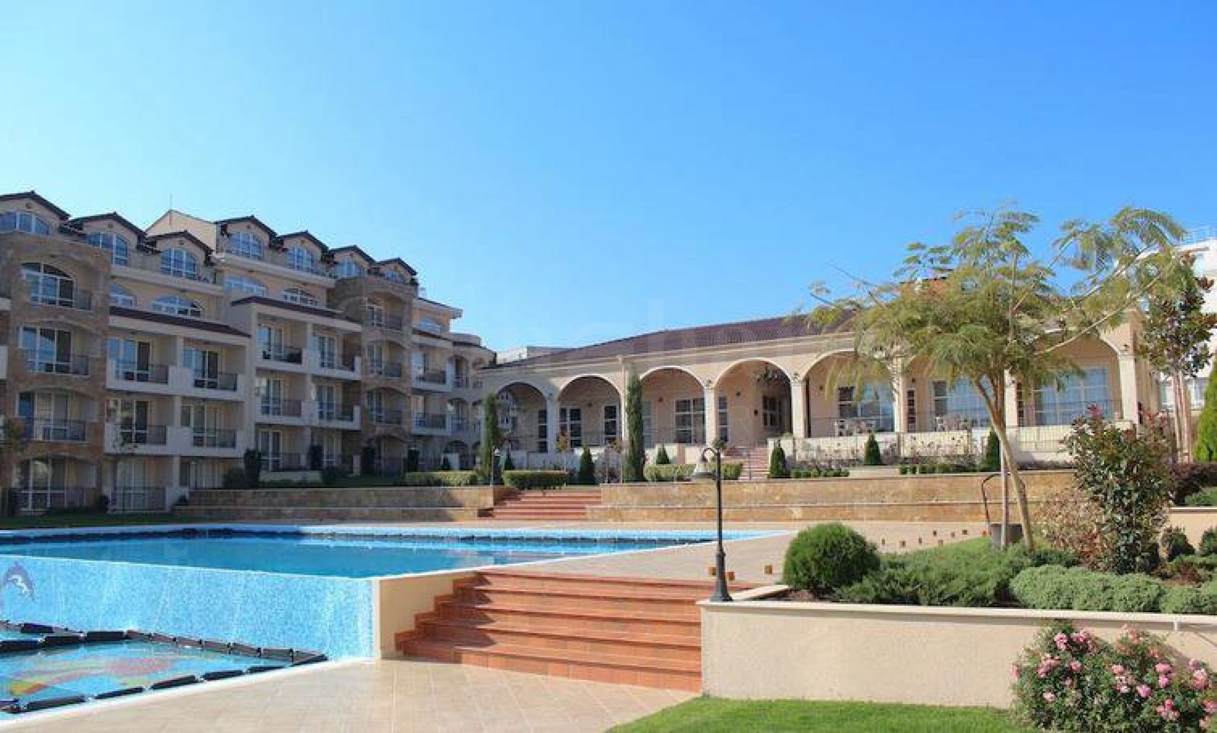 Zidovi u apartmanu su ofarbani lateksom, podna obloga je granitogres, prozori su sa kvalitetnom PVC stolarijom. Sobe u apartmanu su hladne tokom leta, a moderan enterijer u svetlim tonovima ispunjen je harmonijom i estetikom morskih pejzaža. Odlično održavani zajednički prostori, tišina i mir, kao i mnogobrojne pogodnosti u kompleksu savršeno dopunjuju ukupnu atmosferu profinjenosti, komfora i relaksacije. Osim toga, kompleks ima sledeće dodatke: