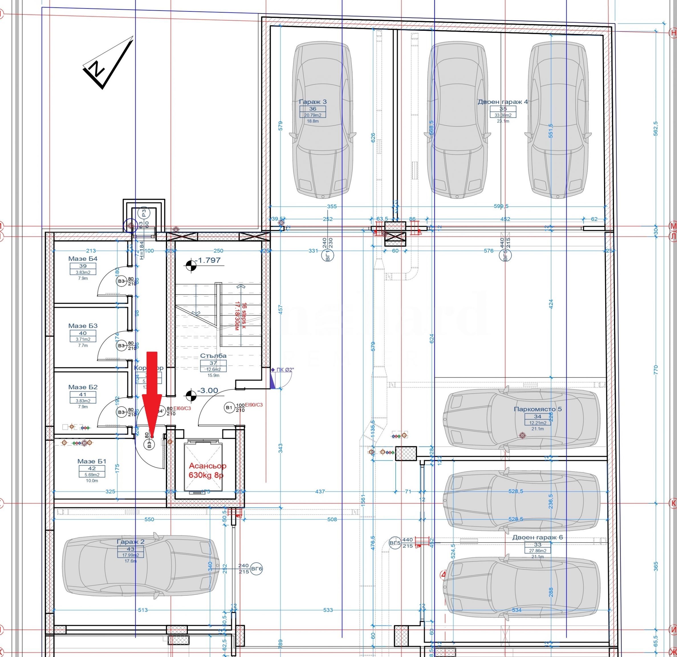 Podrum se nalazi u suterenskom spratu, zajedničkom za zgrade „A“ i „B“, zauzima mesto „B1“. Ukupna površina je 6,13 m2. Podrumi su opremljeni čvrstim i protivpožarnim vratima. Suterenski prostor ima ventilacioni sistem i toplu vezu sa spratovima zgrade putem lifta. Suterenski prostor je prostran i manevrisanje je lako. Dva podzemna nivoa sa garažama, parking mestima i podrumima opslužuju se rampama. Pod podzemnih garaža i podruma je od brušenog betona sa horizontalnom signalizacijom.