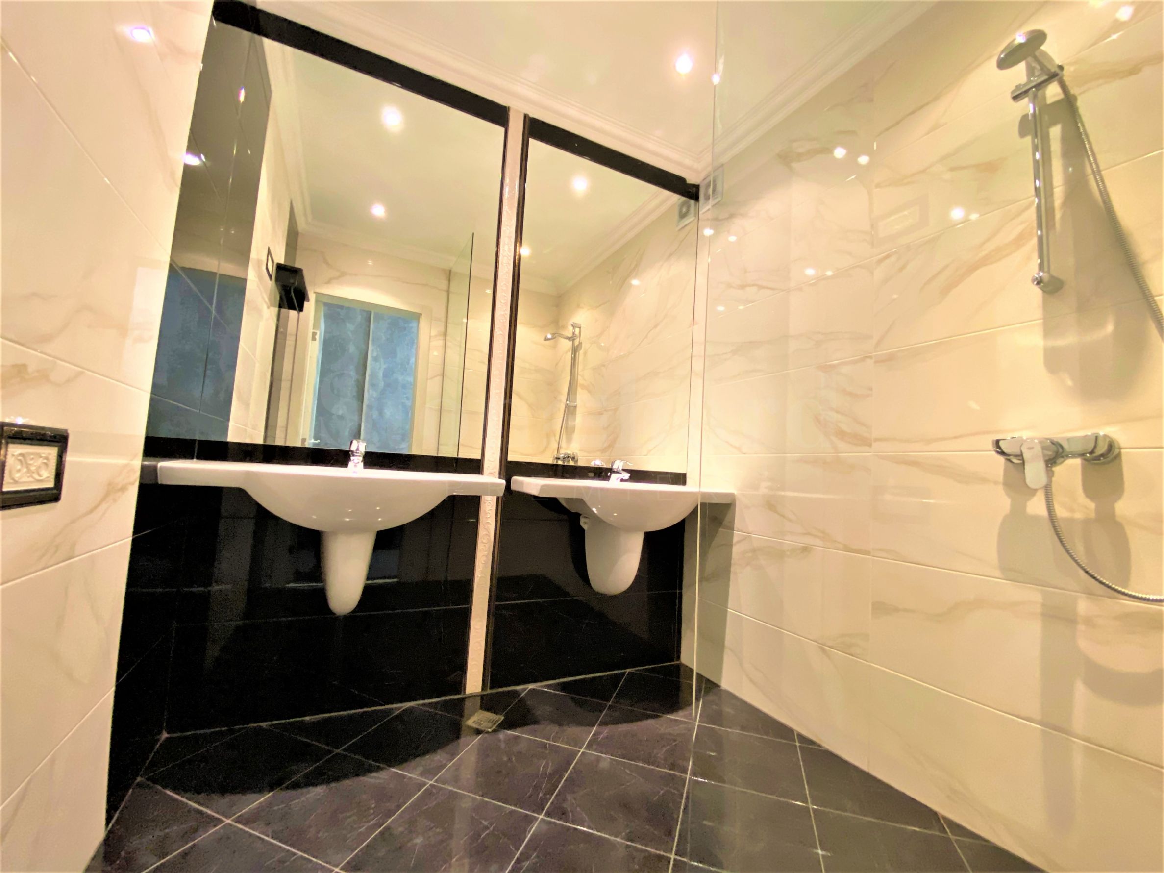 Moderno kupatilo, sa visokokvalitetnim španskim fajansom, dva lavaboa, baterijom i tušem Grohe;