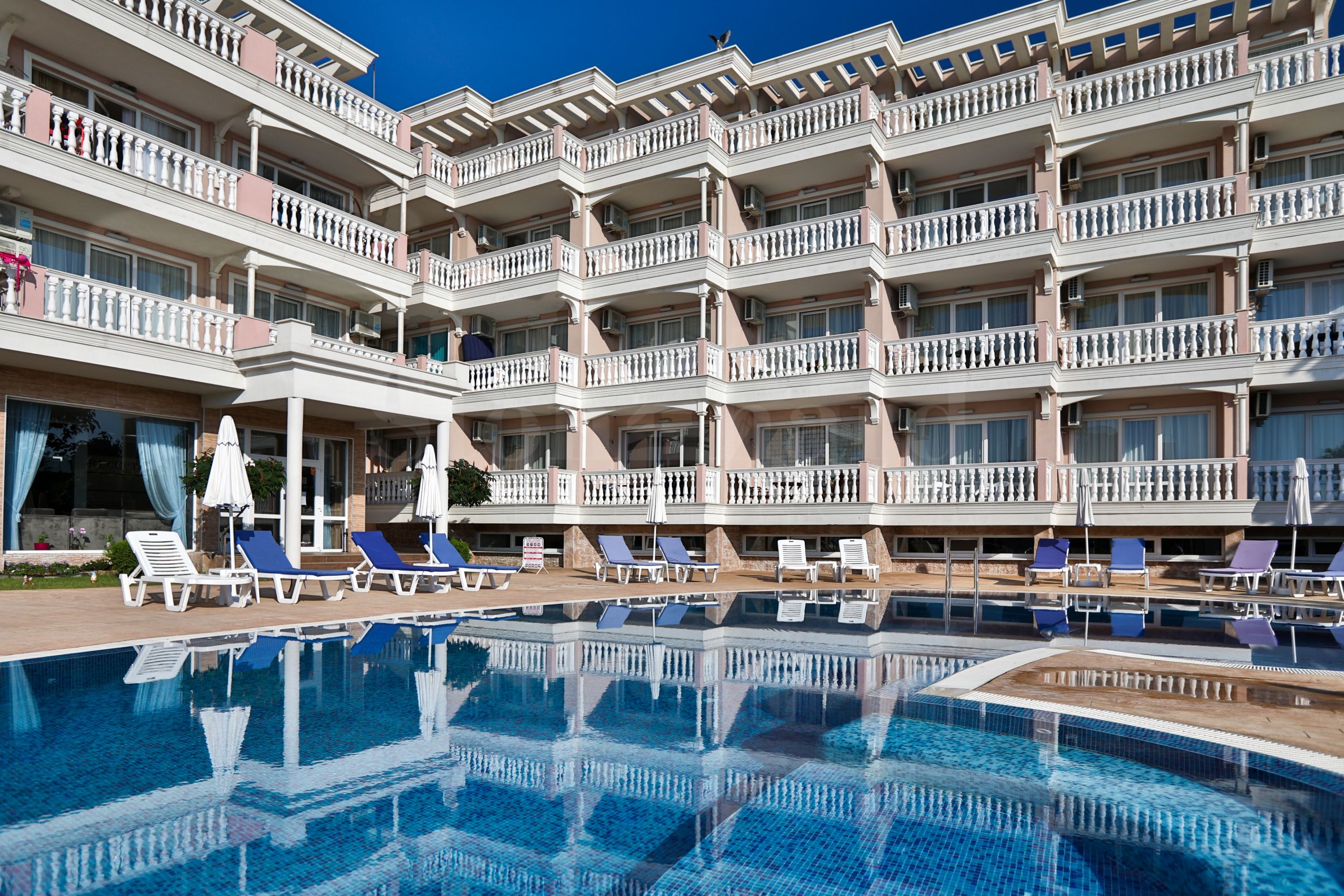 Зграда се истиче својом префињеном и елегантном архитектуром, са пространим терасама са балустрадама. Оријентисана је ка обали мора и пружа невероватан поглед на море и плажу. На територији се налазе сви потребни садржаји за пријатан одмор: базен, подземни паркинг и ресторан, обезбеђење, видео надзор и рецепција.