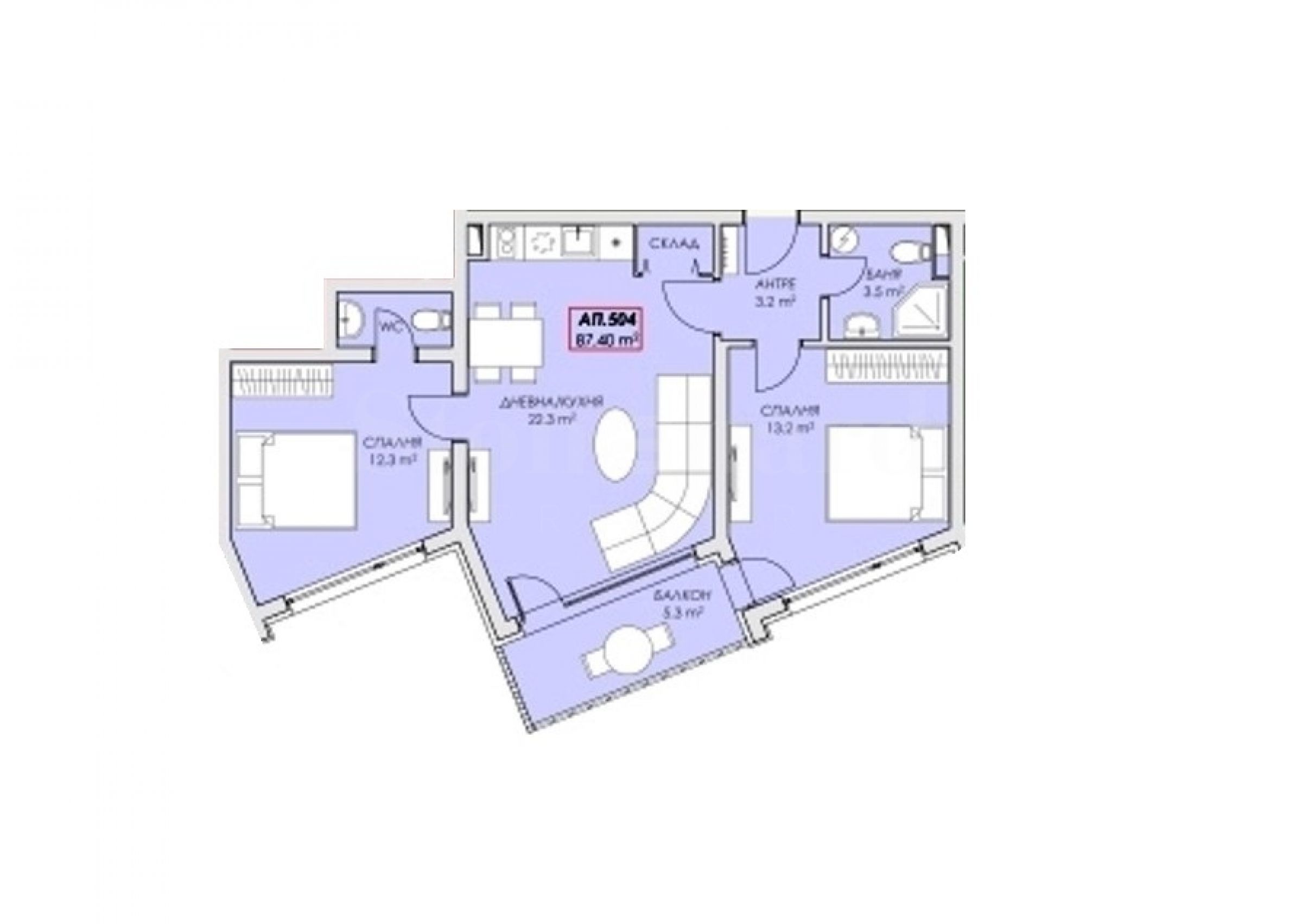 Некретнина се налази на 5. спрату и нуди 87,40 квадратних метара укупне површине са функционално распоређеним собама: дневна соба, спаваћа соба са сопственим тоалетом, друга спаваћа соба, купатило са тоалетом и балкон. Нуди се по систему „кључ у руке“.