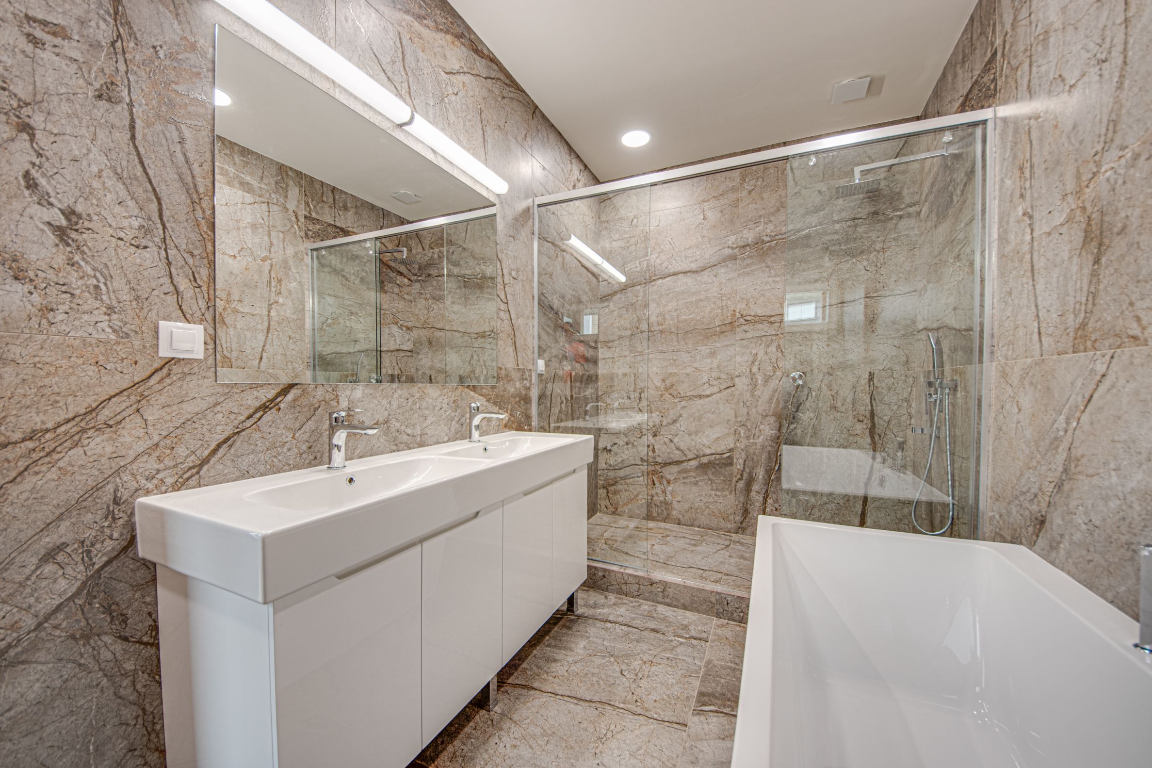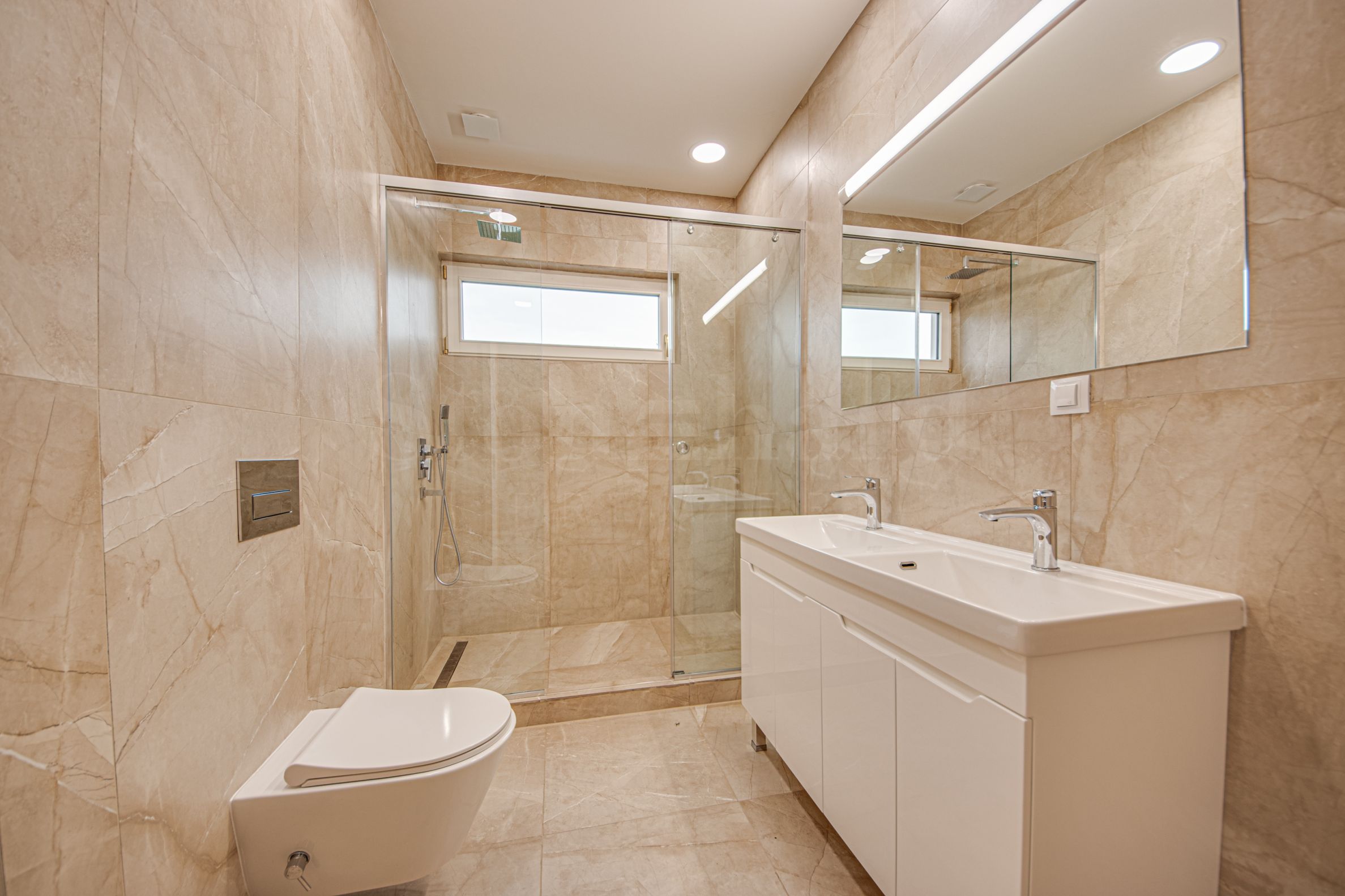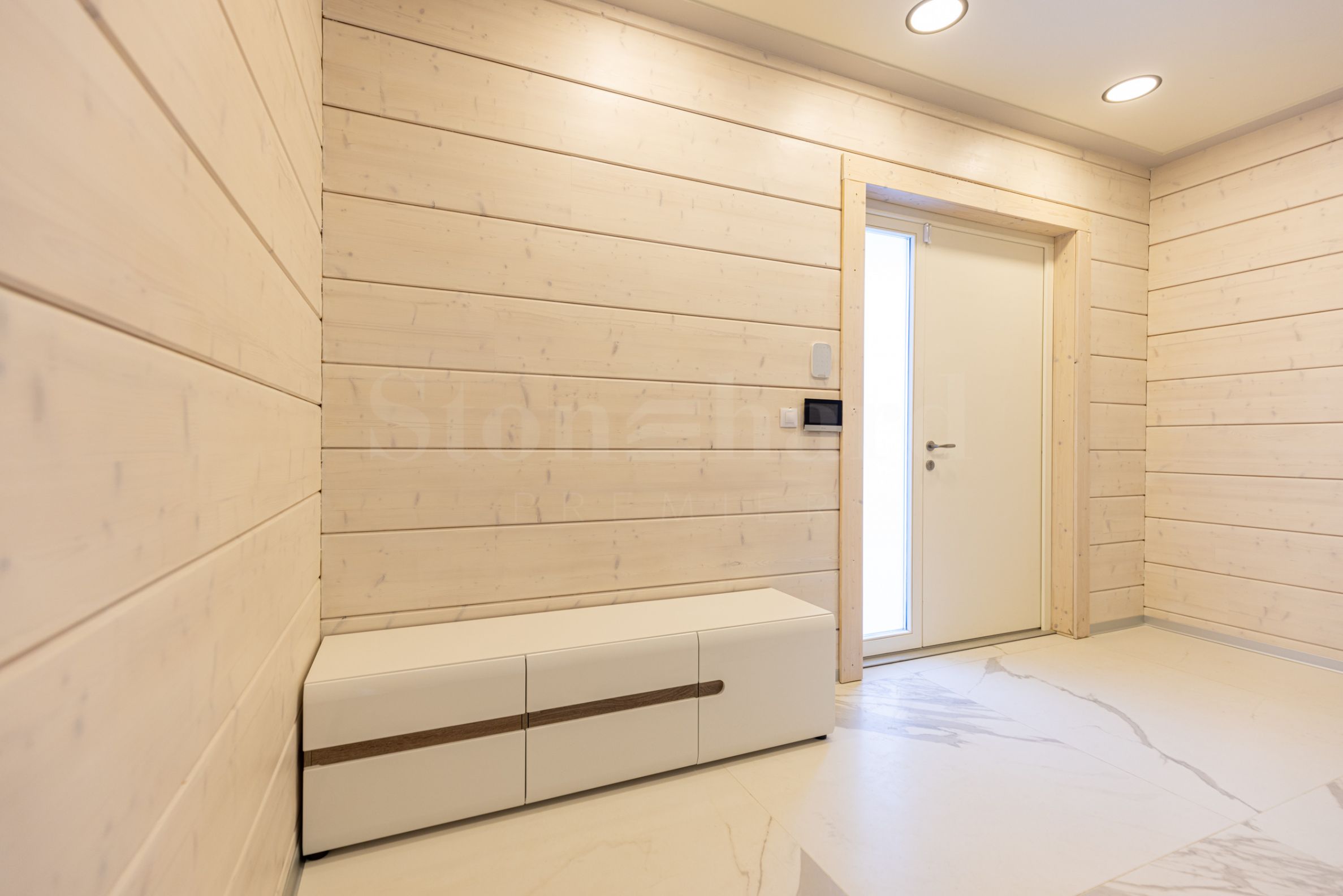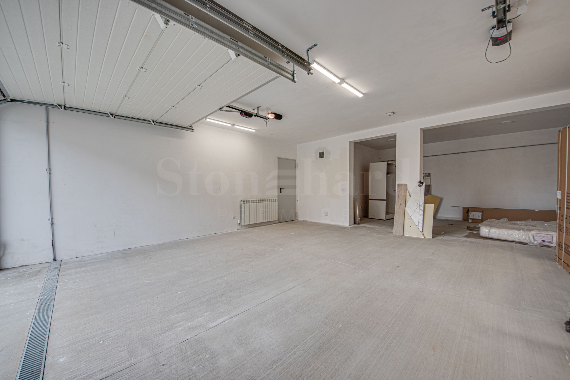 подрум: гаража за два аутомобила, техничка просторија, вешерај, купатило, просторија за фитнес салу (канцеларија, биоскоп итд.), простор за сауну. Подрум је обложен природним каменом, полираним са импрегнацијом против задржавања влаге;