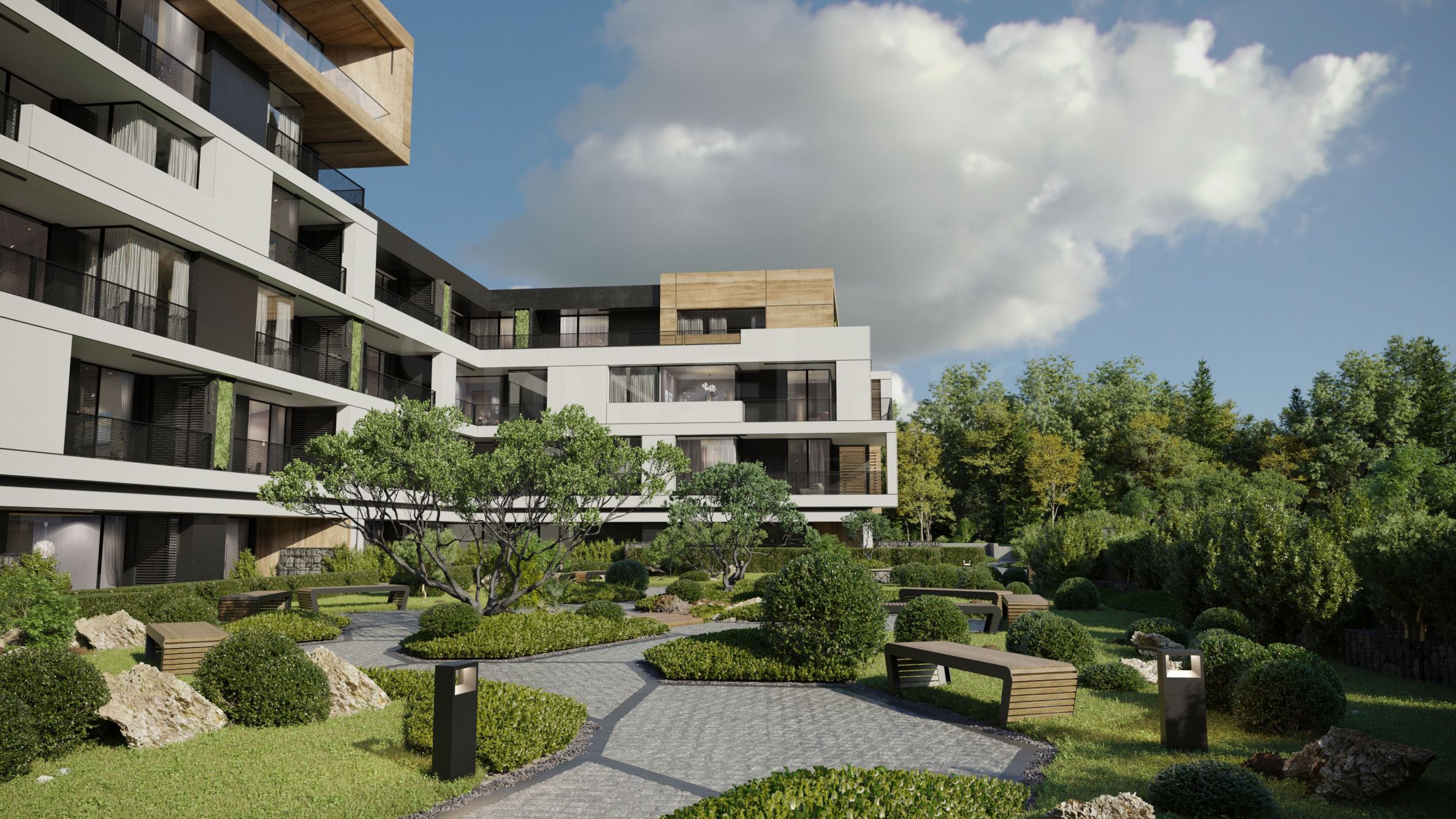 Koncept dinamike u gradskom okruženju tražen je u prostorno-volumenskom i fasadnom odnosu. Projekat predstavlja kompoziciju od 9-, 8-, 6- i 4-spratnih volumena u zajedničkoj stepenastoj strukturi, spuštajućoj se na istok ka budućem parku "Lozenec". Dodatni akcenti u kompoziciji su volumeni penthausa kao svojevrsne kutije, izvedene sa HPL pločama FUNDERMAX orah, u kojima su smešteni luksuzni stanovi sa većom svetlom visinom etaže (3,30 m).