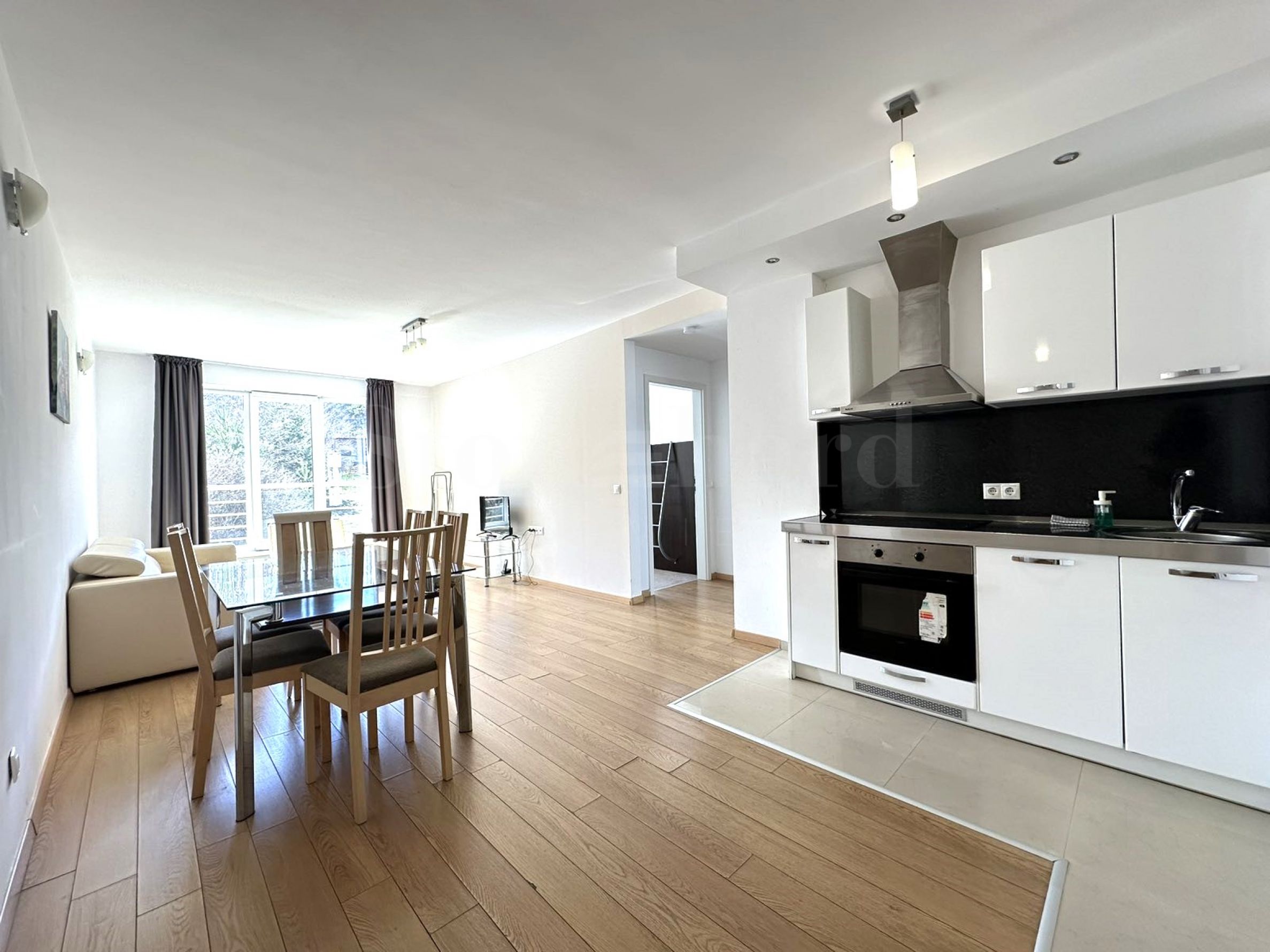 Stan ima individualni dizajn, sa velikom pažnjom prema detaljima. U dekoraciji su korišćeni samo najkvalitetniji i prirodni materijali. Prostrani dnevni boravak ima meku garnituru i belu kuhinju, koja je potpuno opremljena visokokvalitetnom tehnikom: rerna, ploče za kuvanje i frižider.
