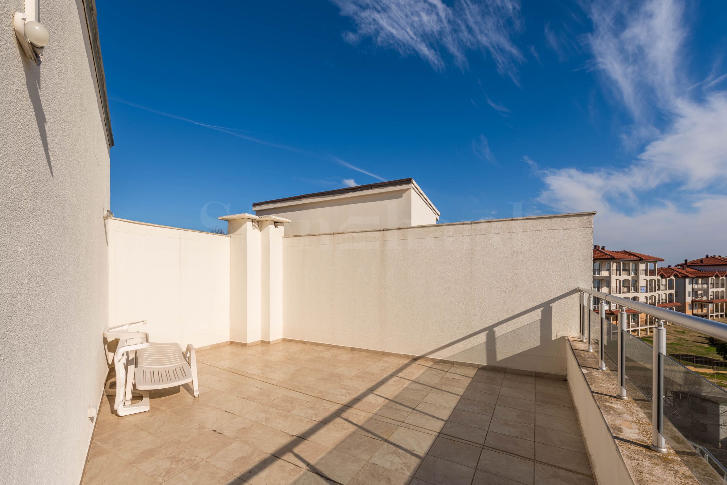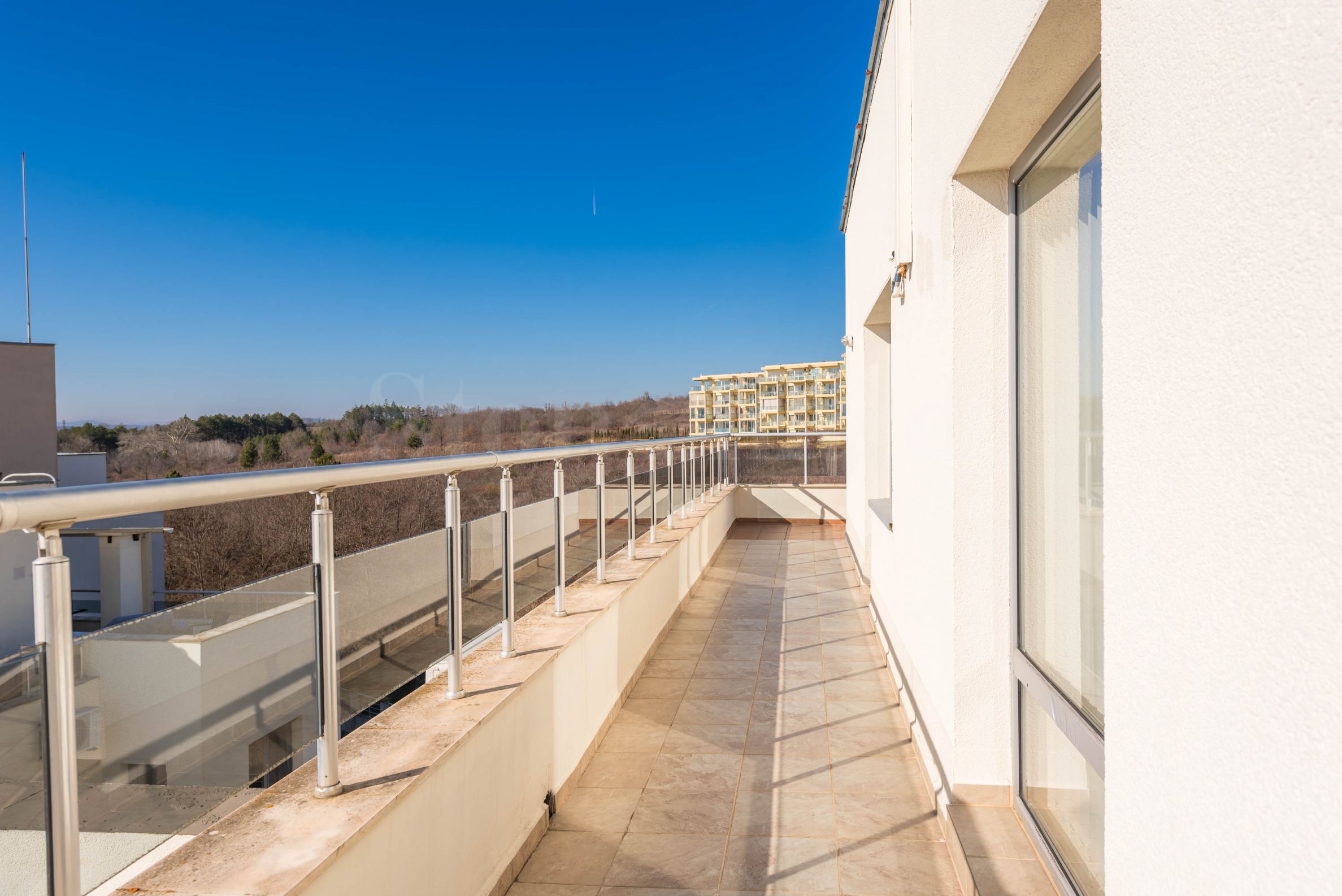 ogromna terasa oko celog apartmana sa jedinstvenim pogledom na more i Obzor.Stan je potpuno namešten i opremljen visokokvalitetnim kućnim aparatima i nameštajem. Grejanje je rešeno klima uređajima.