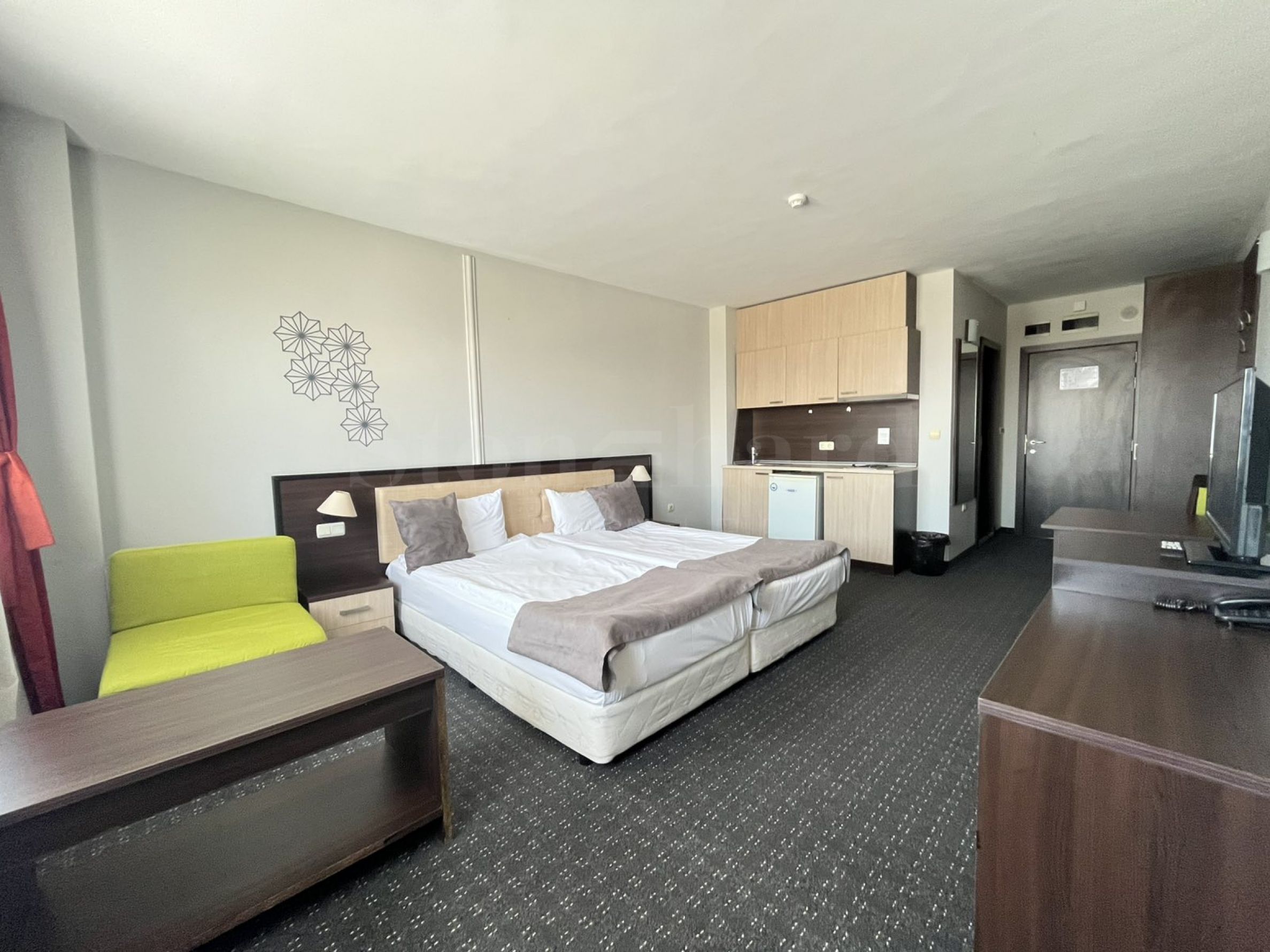 Stan se sastoji od: hodnika, francuskog ležaja, komode, televizora, kupatila sa toaletom, sofe, stola za dnevnu sobu.