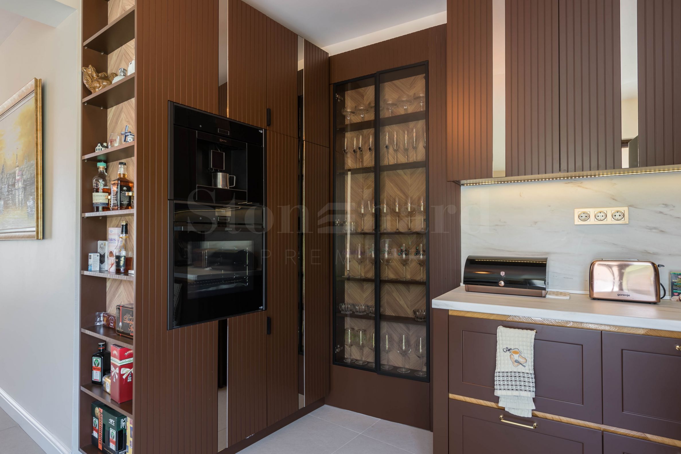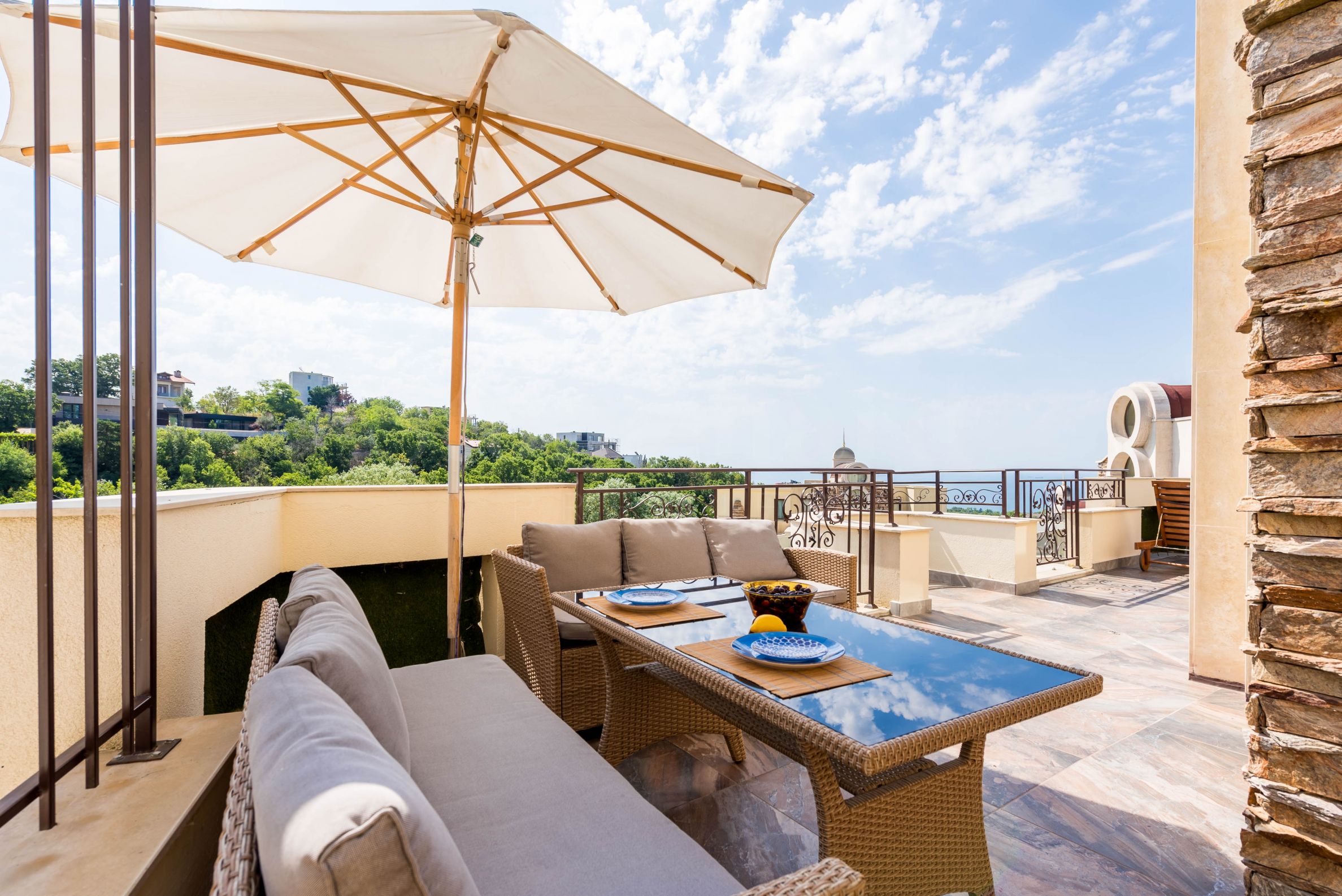 Penthaus je dizajnerski završen i namešten kvalitetnim materijalima i funkcionalnim nameštajem. Kuhinjski ormarići su izrađeni od masiva, a kućni aparati su renomiranog nemačkog proizvođača. Na terasi sa panoramskim pogledom na more nalazi se profesionalni roštilj sa opremljenom zonom za prijatne ručkove i večere sa porodicom i prijateljima. Otvorena terasa na prvom nivou pogodna je i za letnje sunčanje.