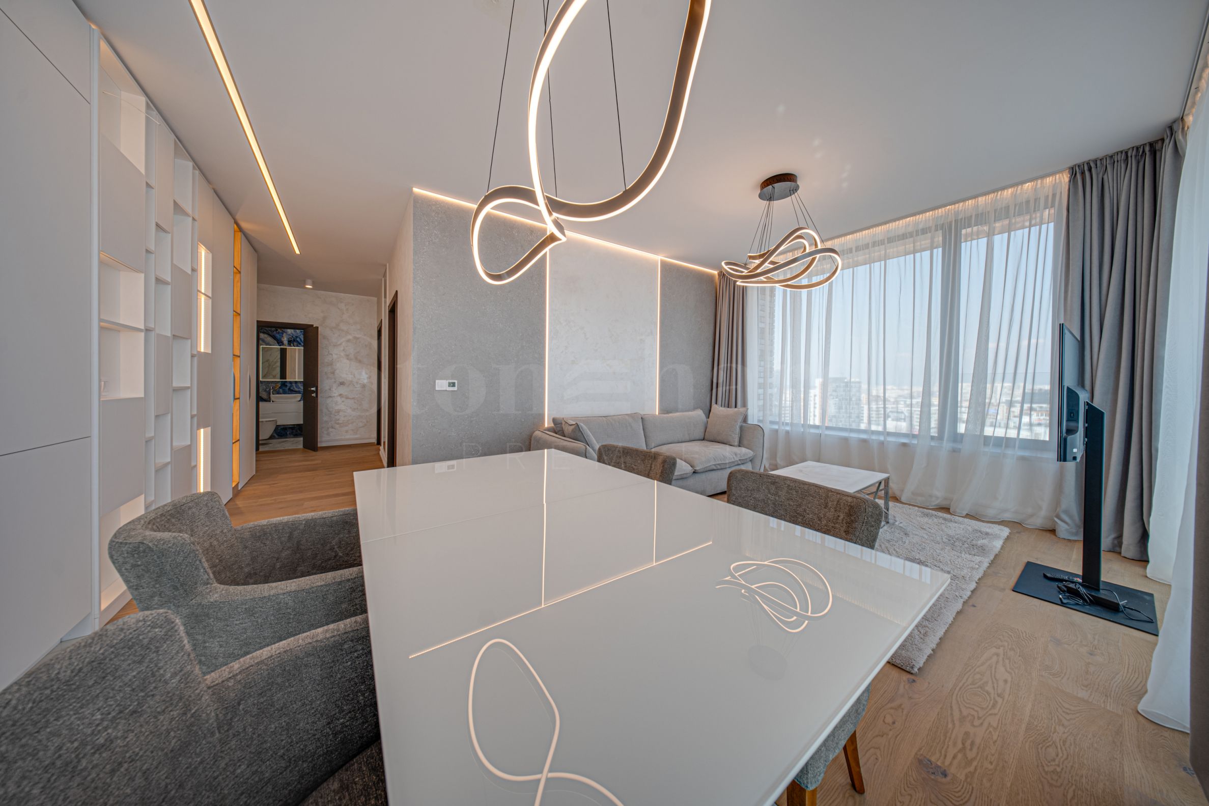 Apartman od 99 kvm je smešten na 12. spratu, sa panoramskim pogledom na grad. Nekretnina je svetla, nudi moderan dizajnerski izgled i enterijer sa čistim linijama. Veliki prozori doprinose prostranosti i obilju svetlosti, a kvalitetni materijali i elegantan nameštaj - udobnosti i eleganciji.