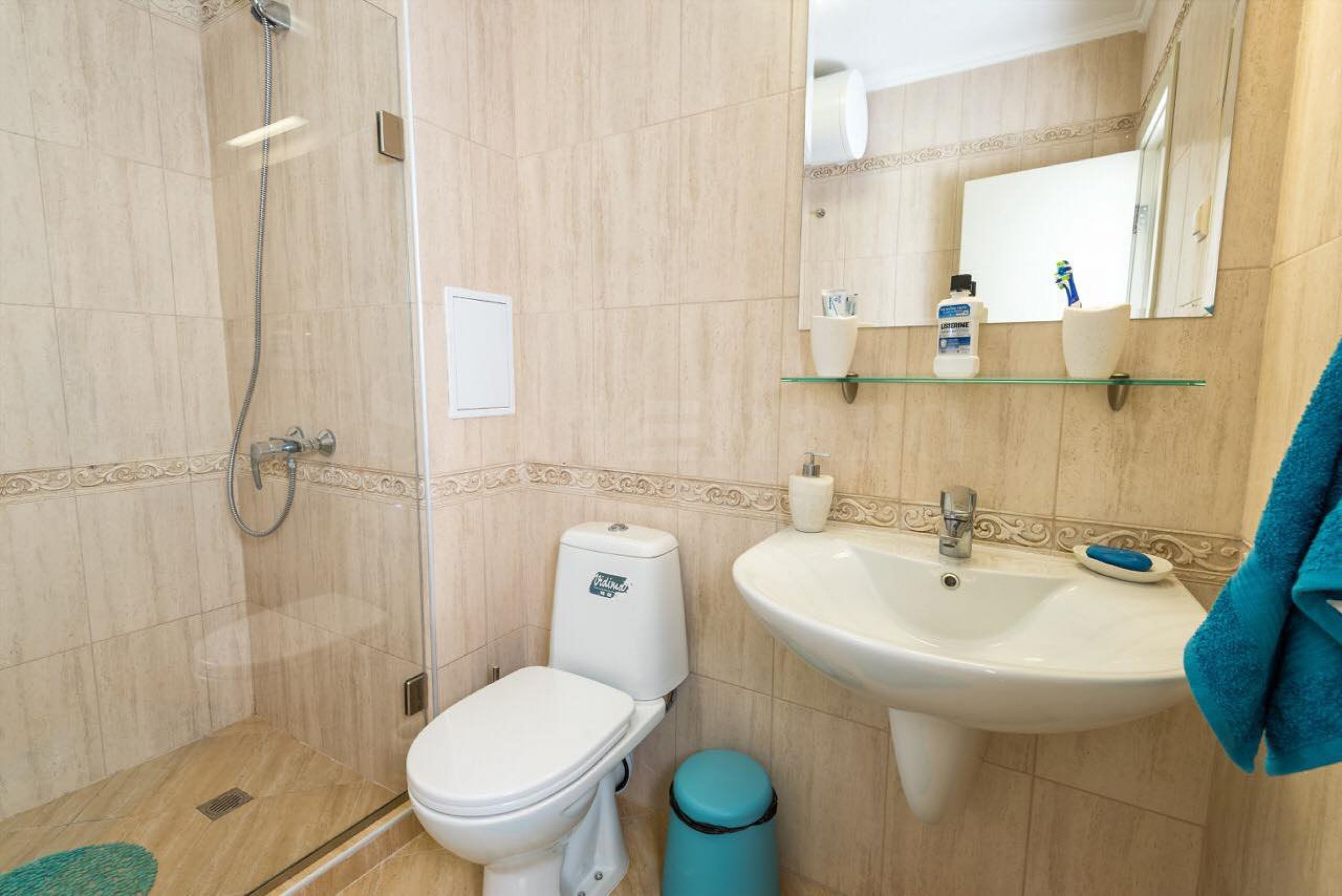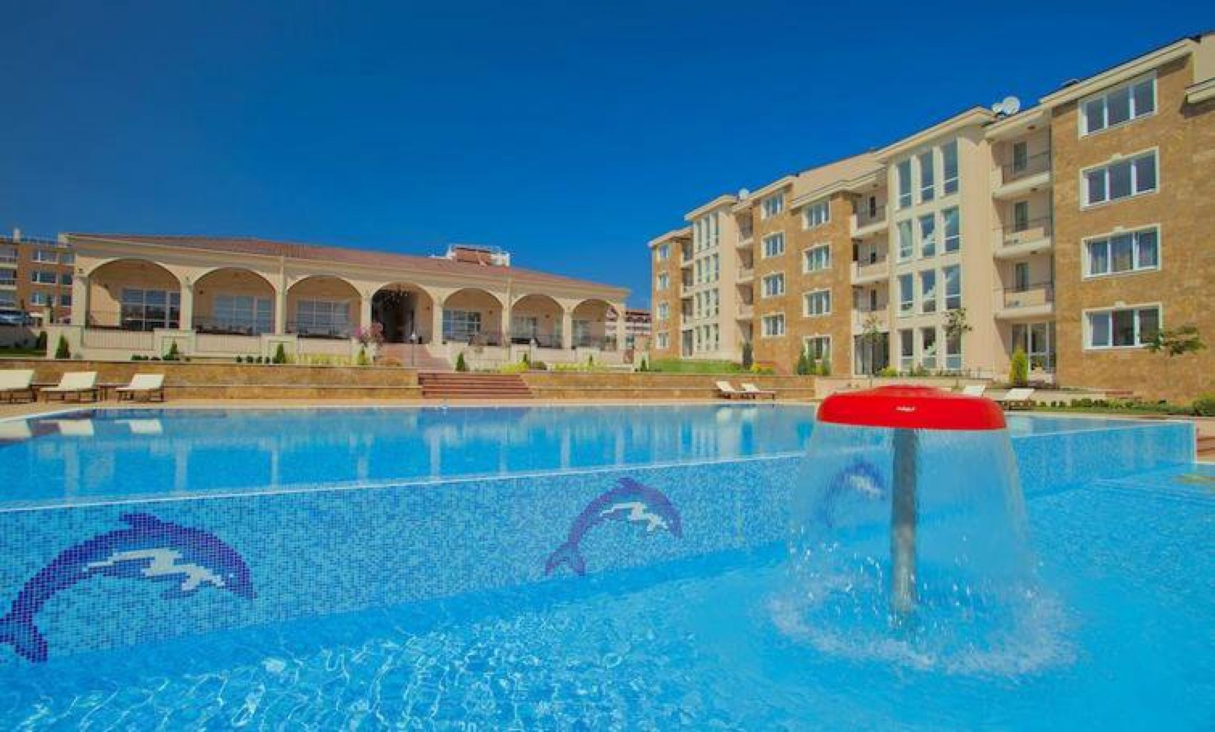 Zidovi u apartmanu su ofarbani lateksom, podna obloga je granitogres, prozori su sa kvalitetnom PVC stolarijom. Sobe u apartmanu su hladne tokom leta, a moderan enterijer u svetlim tonovima ispunjen je harmonijom i estetikom morskih pejzaža. Odlično održavani zajednički prostori, tišina i mir, kao i mnogobrojne pogodnosti u kompleksu savršeno dopunjuju ukupnu atmosferu profinjenosti, komfora i relaksacije. Osim toga, kompleks ima sledeće dodatke: