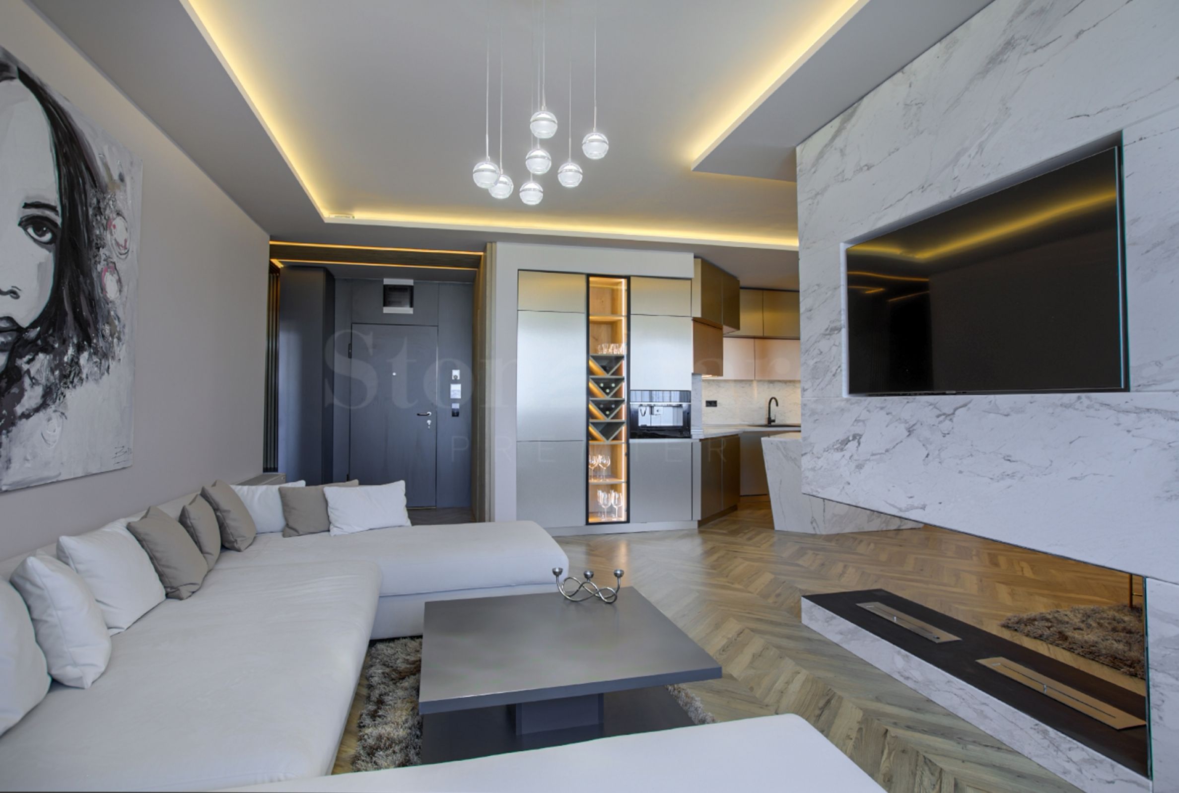 Тапацирани намештај; трпезаријски сто од мермерних плоча према индивидуалном пројекту; шест столица; сточић од природног фурнира; камин на гас; уграђена кухиња; две ЛЕД диоде „Samsung“; машина за прање веша са машином за сушење веша „Beko“; фрижидер „Eurolux“; уграђена микроталасна пећница „Eurolux“; рерна са плочама за кување „Eurolux“; машина за прање судова „Eurolux“; клима уређај „Gree“; аспиратор „Faber“; кревет са душеком; ормар са стакленим преградама; слике; расветна тела.